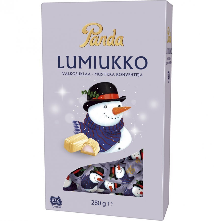 Lumiukon valkosuklaakonvehteja herkullisella mustikka-maitotryffelitäytteellä. Nämä konvehdit piristävät pakkaspäivää! Pakkauskoko 280 g. Ainesosat:Sokeri, rasvaton maitojauhe, kaakaovoi, kasvirasvat (palmuydin, palmu), täysmaitojauhe, maitorasva, emulgointiaine (lesitiini), aromit (mm. vanilliini), mustikkamehu (0,1 %), maltodekstriini (maissi). Saattaa sisältää pieniä määriä hasselpähkinää ja mantelia. Ingredienser:Socker, skummjölkspulver, kakaosmör, vegetabiliska fetter (palmkärna, palm), . . .