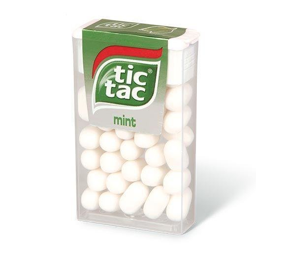 Tic Tac Mint 49 gTic Tac blev opfundet i 1969 i Italien og er en lille velsmagende pastil, som giver en behageligt frisk mund.Ydersidens søde smag og det kølige, sofistikerede indhold giver en balance, der skærper alle sanserne.Sammen med den unikke æske har det gjort Tic Tac til et af verdens mest berømte varemærker, der nu sælges i mere end 120 lande.INGREDIENSERSukker, maltodextrin, fruktose, fortykningsmiddel (gummi arabicum), risstivelse, antiklumpningsmiddel (magnesiumsalte af fedtsyrer), aromaer, æterisk minteolie, overfladebehandlingsmiddel (carnaubavoks)ERNÆRINGPer 100 g Per STK / KPL (0,49 g)Energi (kJ / kcal) 1685 / 397 8/2Fedt (g) 0,5 0heraf mættede fedtsyrer (g) 0,5 0Kolhydrat (g) 97,5 0,5heraf sukkerarter (g) 94,5 0,5Protein (g) 0,1 0Salt (g) 0,028 0